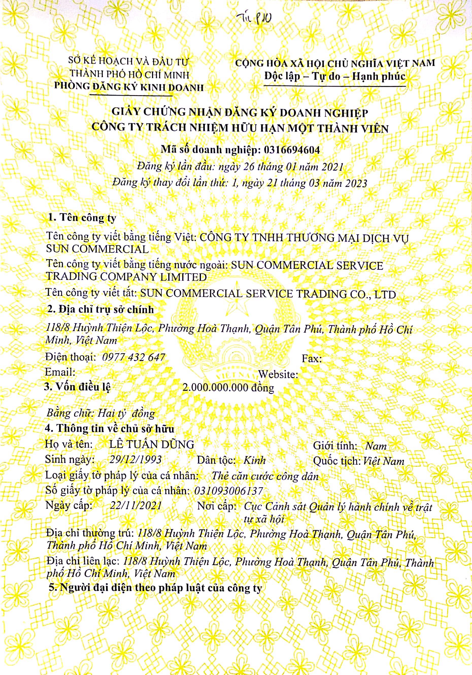 - Tên công ty: CÔNG TY TNHH THƯƠNG MẠI DỊCH VỤ SUN COMMERCIAL